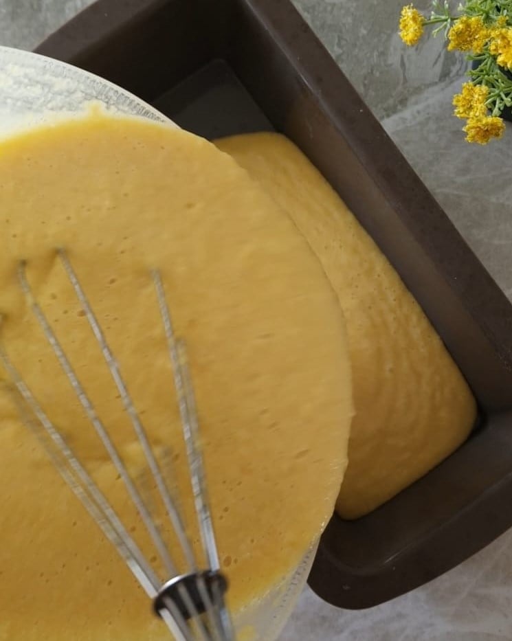 Alles in eine Silikon-Kastenform von 24x10cm gießen, wenn Sie eine Aluminiumform verwenden, denken Sie daran, diese vor dem Gießen der Mischung einzufetten und zu mehlen.