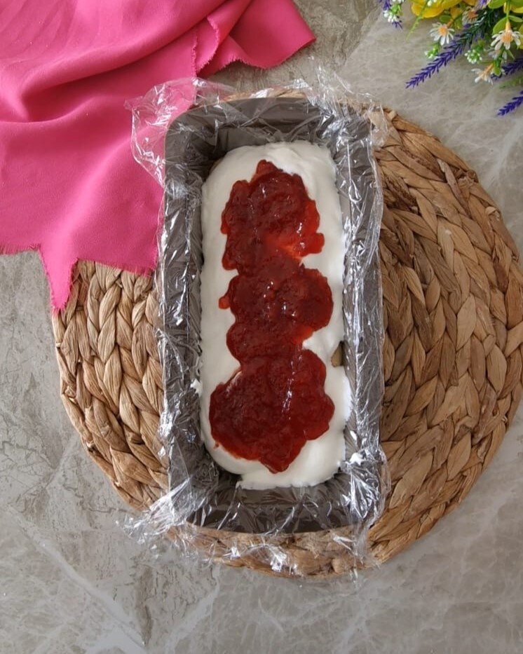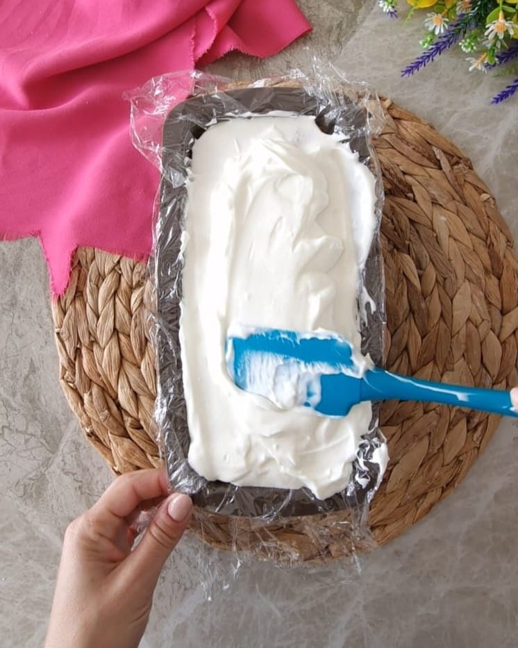 • Beginnen Sie damit, eine Kastenform von 25 cm mit Frischhaltefolie auszulegen, dann die Sahne zusammen mit 2 Esslöffeln Zucker schlagen.