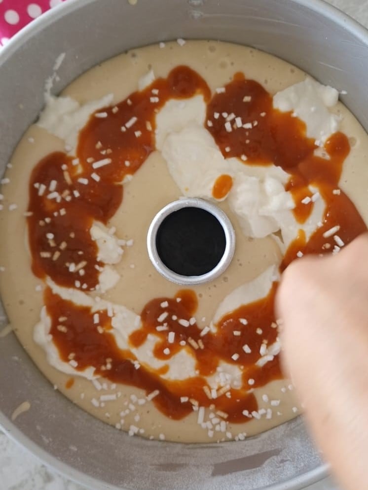 • Mischen Sie nun den Ricotta, die Marmelade, mit dem Zucker und geben Sie es über den Teig zusammen mit dem Zuckerstreusel.