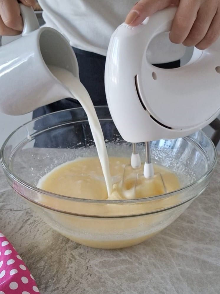 • Danach das Öl in einem dünnen Strahl einfüllen und dann die Milch bei Raumtemperatur (nicht kalt) hinzugeben