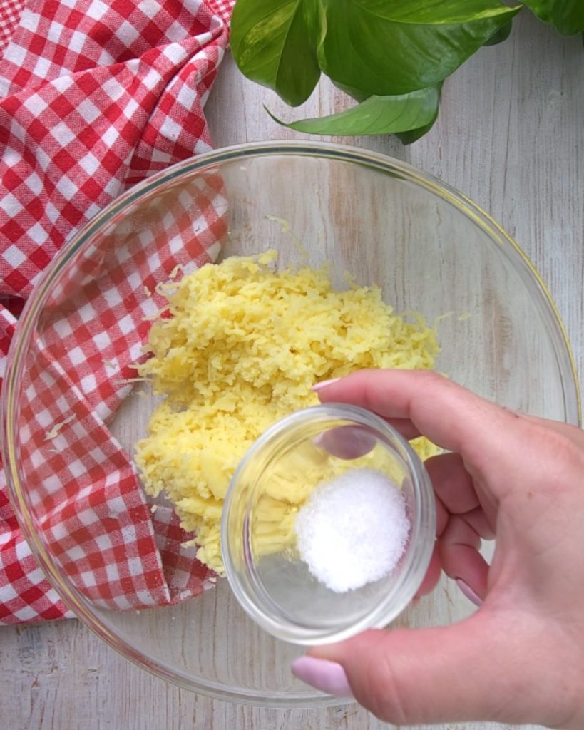 Sobald sie gekocht sind, drückt sie noch heiß durch die Kartoffelpresse, fügt das Salz hinzu