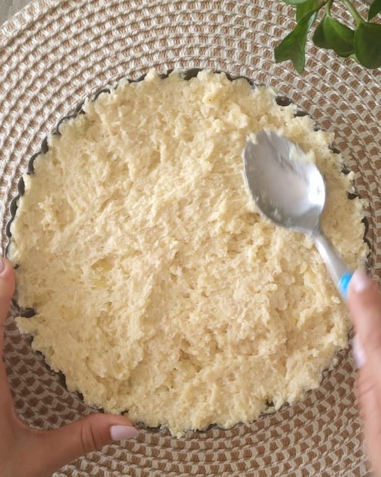 Nun mit einer Gabel alles gut vermischen. Dann geben Sie die Mischung in eine mit Butter gefettete und mit Paniermehl bestreute Form und glätten Sie sie mit einem Spatel.