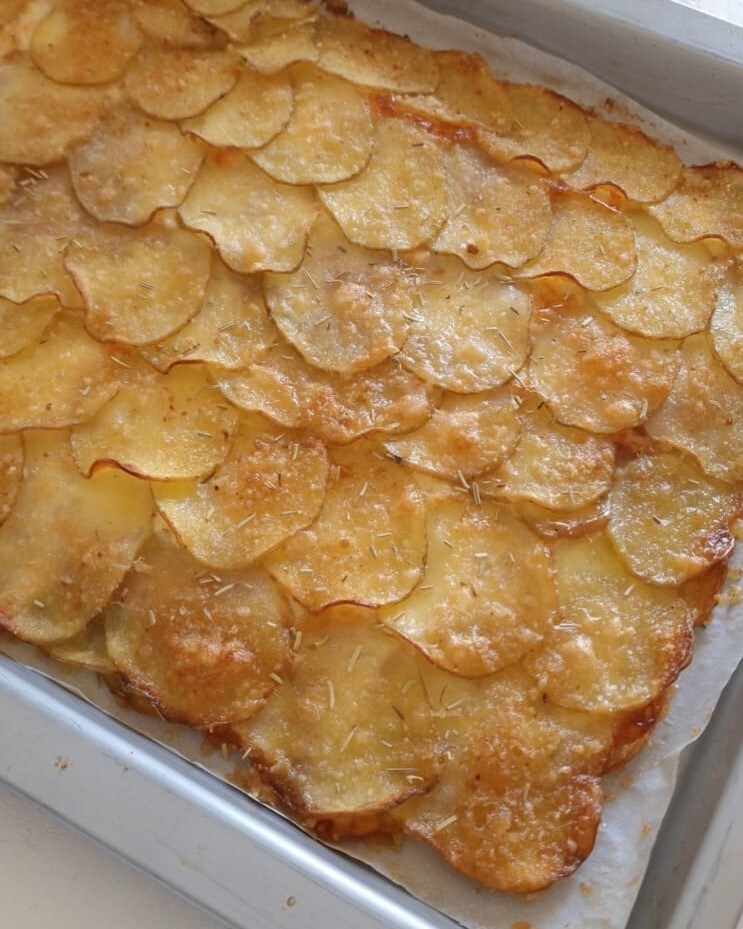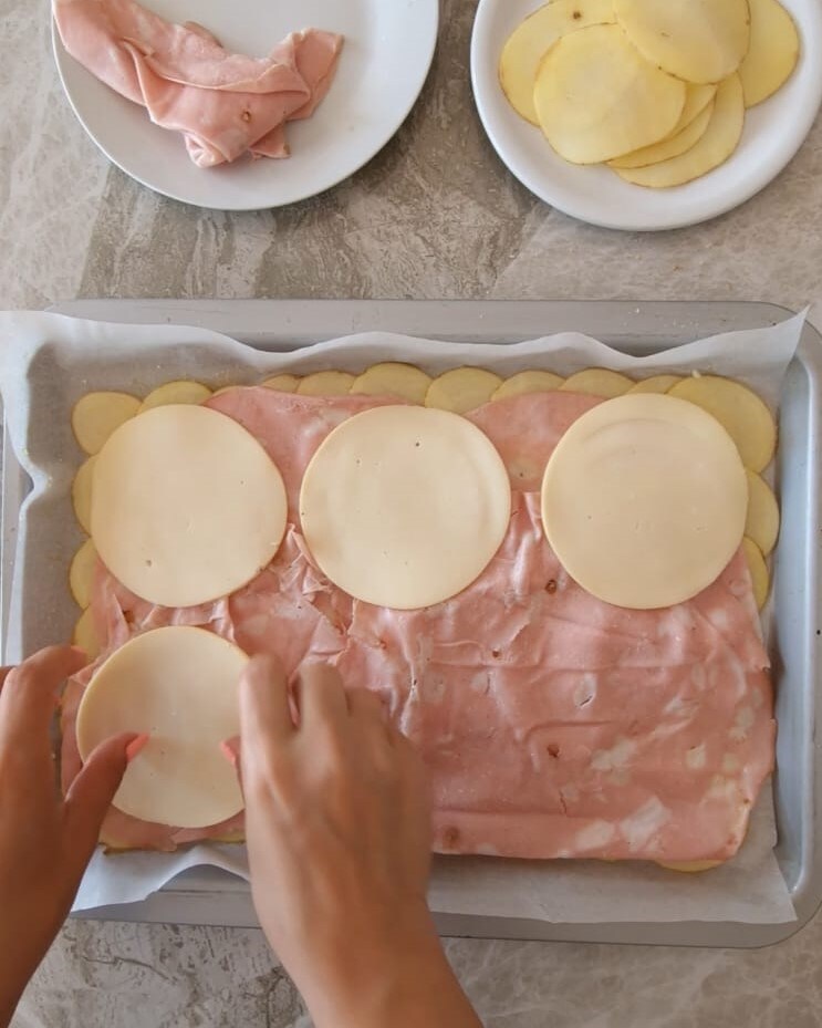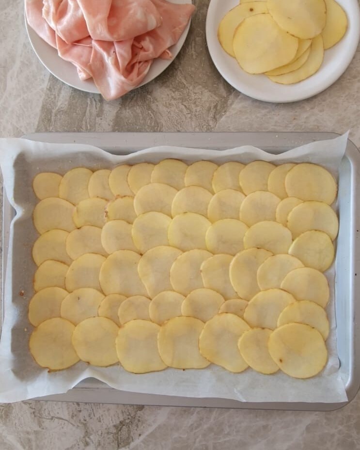 mit einer weiteren Schicht überlappender Kartoffeln bedecken, wie zuvor auf der Unterseite gemacht.