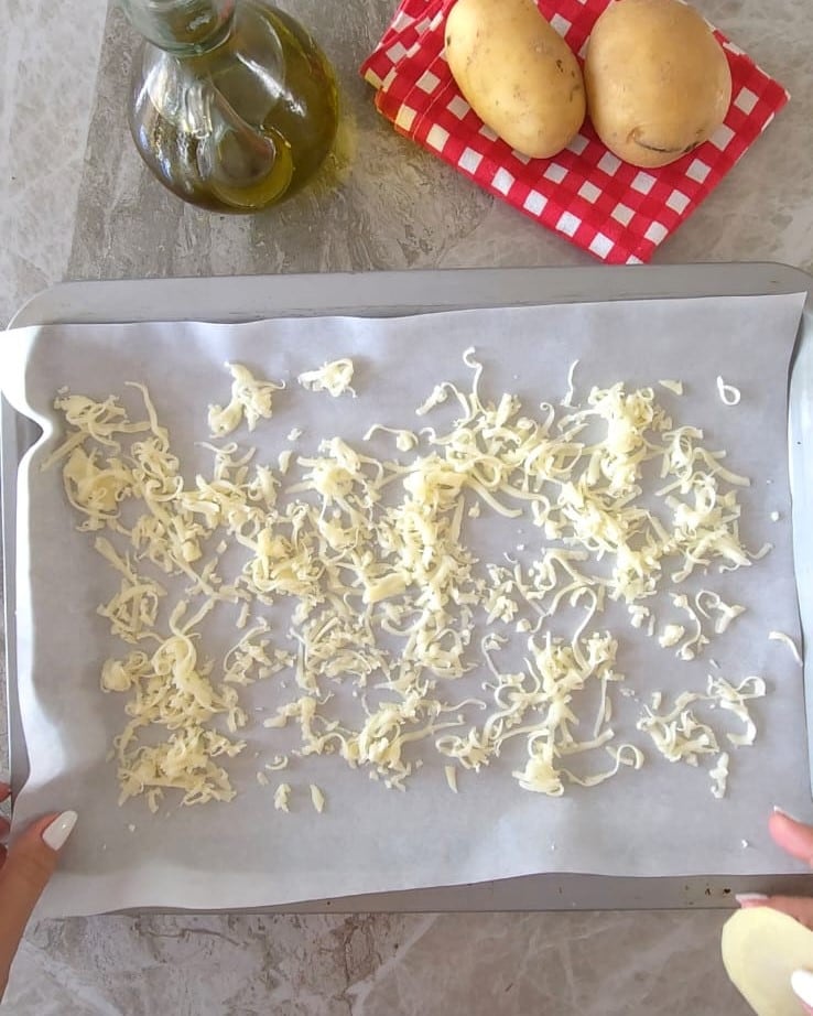 Zu diesem Zeitpunkt ein Backblech mit Backpapier auslegen, dann mit dem geriebenen Käse bestreuen, anschließend die Kartoffelscheiben nebeneinander legen.