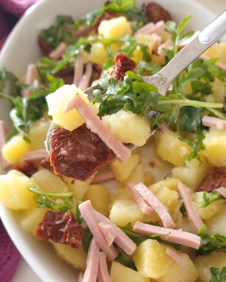 Kartoffelsalat mit Schinken und Rucola ist ein außergewöhnliches Hauptgericht, einfach und lecker, frisch serviert. Ein schnelles Rezept, das auch am Abend zuvor zubereitet werden kann, um es dann im Büro oder am Meer zu genießen. Man kocht die Kartoffeln und lässt sie abkühlen, dann wird der Salat mit gekochtem Schinken, der eventuell durch Speck ersetzt werden kann, getrockneten Tomaten und Rucola zubereitet und mit extra nativem Olivenöl gewürzt. Sie können den Salat personalisieren, indem Sie die Zutaten nach Belieben hinzufügen oder ersetzen. Nun überlasse ich Ihnen das Rezept, vergessen Sie nicht, mir auf meinen Social-Media-Seiten Facebook und Instagram zu folgen.