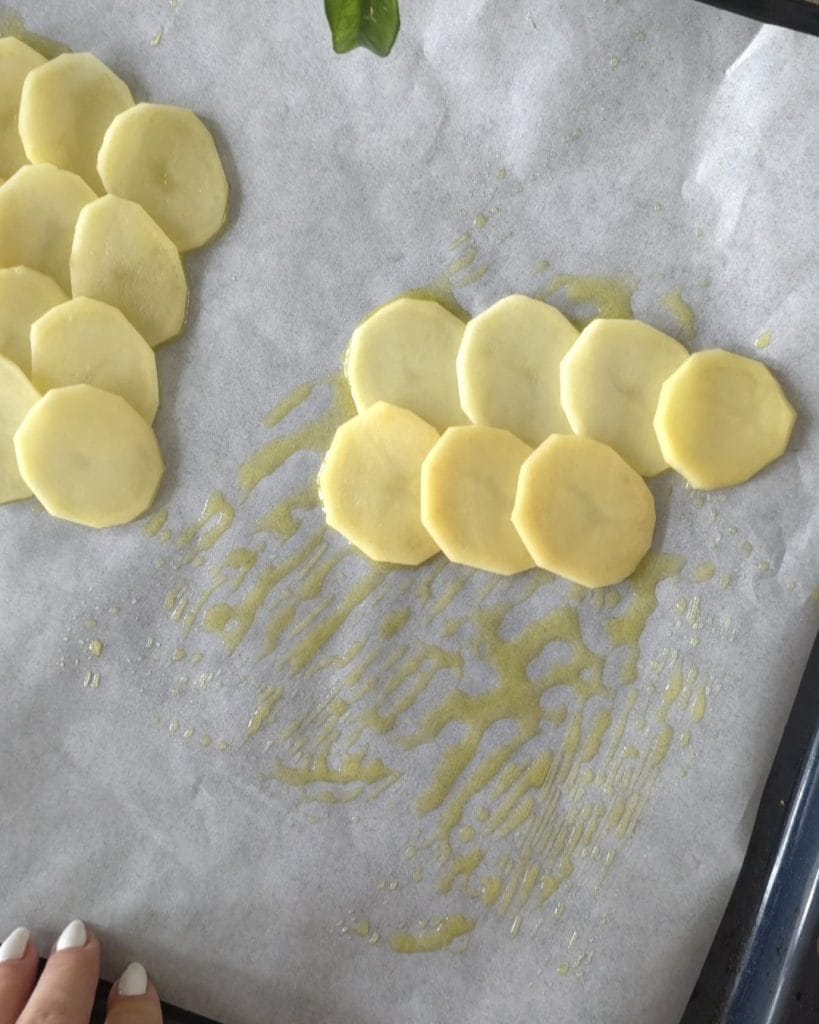 Waschen Sie die Kartoffeln, schälen Sie sie und schneiden Sie sie mit einer Mandoline in dünne Scheiben (alternativ können Sie auch einen elektrischen Allesschneider verwenden). Legen Sie die Scheiben nun leicht überlappend nebeneinander auf ein mit Backpapier ausgelegtes und leicht geöltes Backblech.