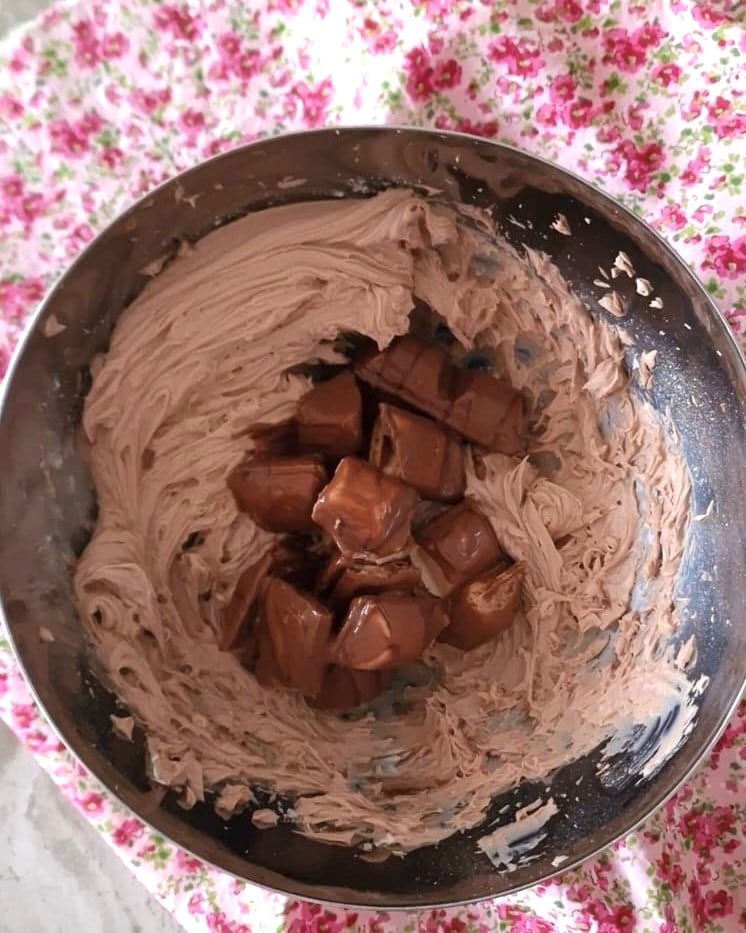 • Weicht den Mascarpone mit 1 Esslöffel Zucker und Nutella auf, dann fügt das geschmolzene Kinder Bueno hinzu, entweder im Wasserbad oder für ein paar Sekunden in der Mikrowelle.