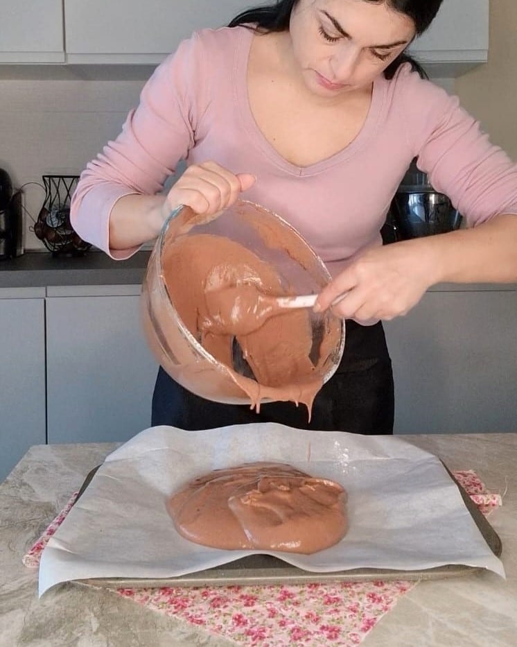 • Gießt nun den Teig auf ein mit Backpapier ausgelegtes Backblech und backt ihn 9 Minuten bei 180°C im statischen Ofen.