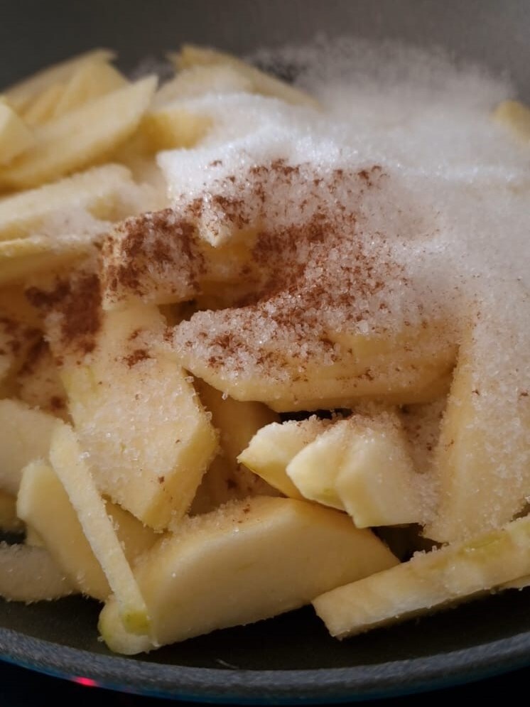 Geben Sie die Äpfel mit Zucker und Zimt in die Pfanne.