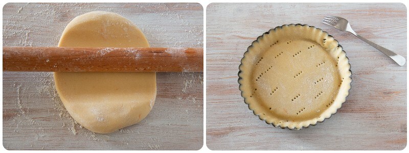 Rollen Sie den Teig mit einem Nudelholz auf eine Dicke von etwa 6-7 mm aus; verwenden Sie zwei Blätter Backpapier, um diese Operation zu erleichtern. Anschließend eine Kuchenform mit einem Durchmesser von 22-24 cm auslegen.