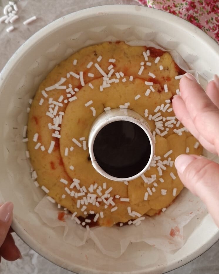 Übertragen Sie ihn in eine mit Backpapier ausgelegte Kuchenring-Form und dekorieren Sie ihn mit Zuckerstreuseln.