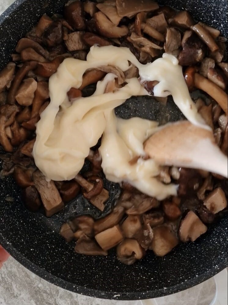 Säubern und schneiden Sie die Pilze. Wenn Sie gefrorene verwenden, waschen Sie sie kurz unter Wasser ab, braten Sie sie mit einer Knoblauchzehe und einem Schuss Öl in der Pfanne an.