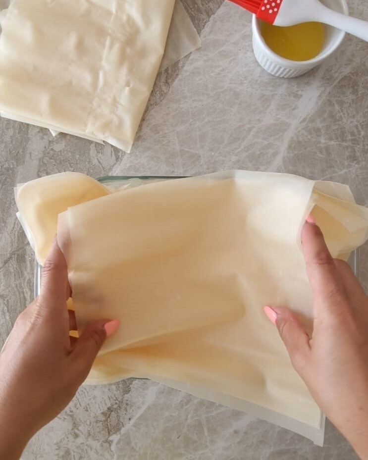 Nun eine Backform von 30×20 cm gut mit geschmolzener Butter einfetten und 2 Blätter Filoteig platzieren.