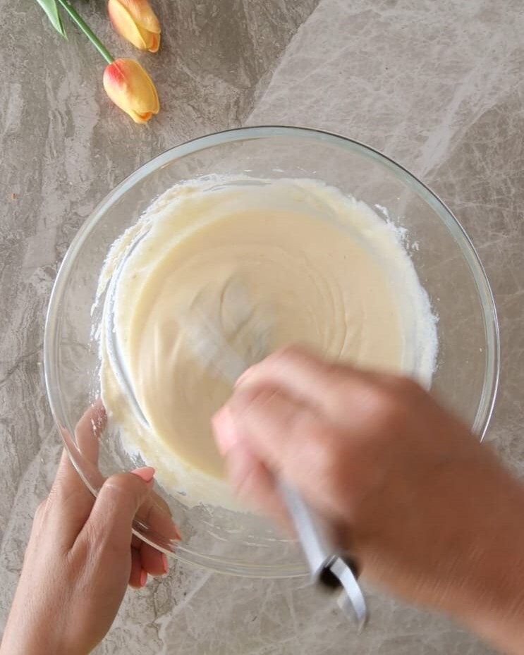 Gut mischen, bis eine glatte und klumpenfreie Creme entsteht.