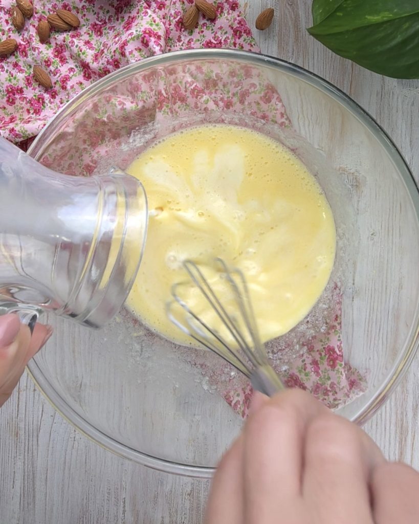 In einer großen Schüssel beginnen Sie damit, die Eier mit Zucker und geriebener Zitronenschale zu schlagen. Mischen Sie alles gut mit einem elektrischen Schneebesen für ca. 5 Minuten, oder bis die Eier schaumig werden. Fügen Sie die Milch und das Öl hinzu.