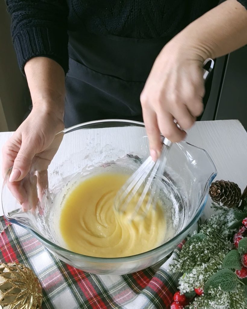 • In einer großen Schüssel das Eigelb mit dem Zucker mischen und mit dem Schneebesen verrühren.