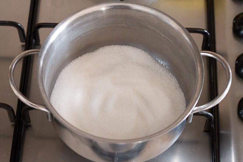 Erhitzen Sie den Zucker in einem Edelstahltopf.