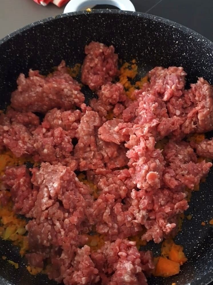 Das Hackfleisch hinzufügen und 5-6 Minuten bei starker Hitze anbraten.