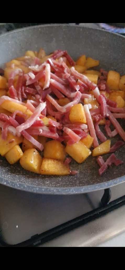 Nachdem der Kürbis und der Speck gar sind, die Pasta abgießen und zum vorbereiteten Belag geben.
