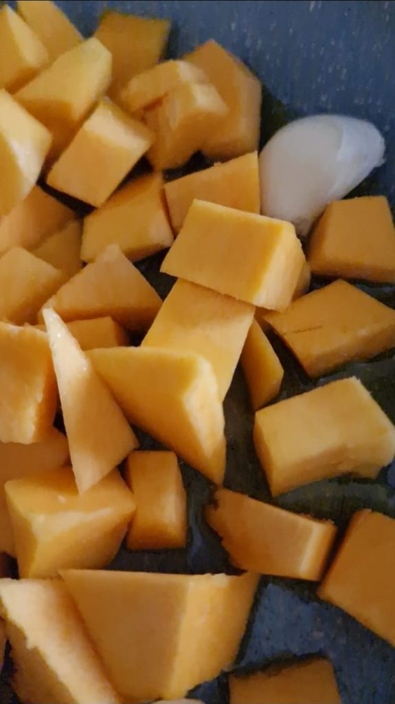 Beginnt damit, den Kürbis zu putzen: zuerst die Kerne entfernen und dann die Schale abschneiden. Anschließend in Würfel schneiden und in einer Pfanne mit etwas Öl und einer Knoblauchzehe anbraten.