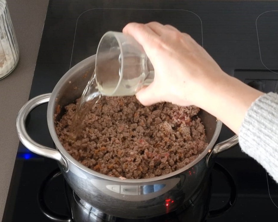 Gebt das Hackfleisch dazu und lasst es etwa 10 Minuten braten, dann den Wein zugießen und verdampfen lassen, umrühren und weitere ca. 10 Minuten weitergaren.