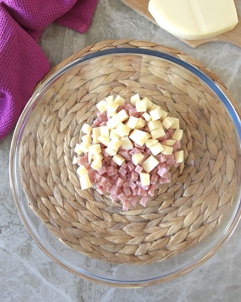 • Schneiden Sie den gekochten Schinken und den Provolone in Würfel und geben Sie sie in eine große Schüssel.