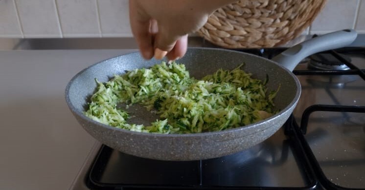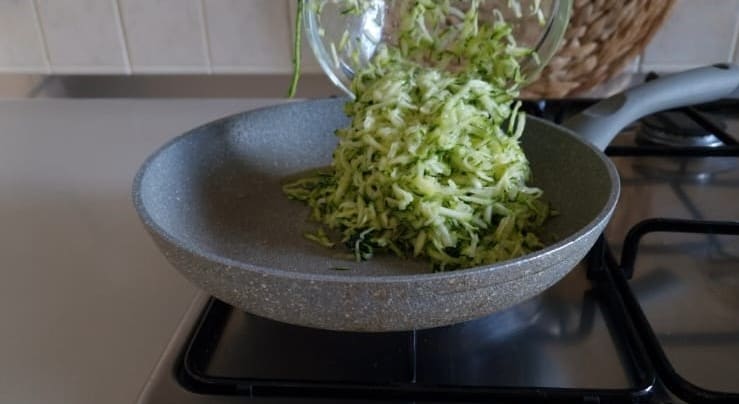 In eine Pfanne geben Sie einen Schuss Öl und eine Knoblauchzehe, braten Sie die Zucchini an.