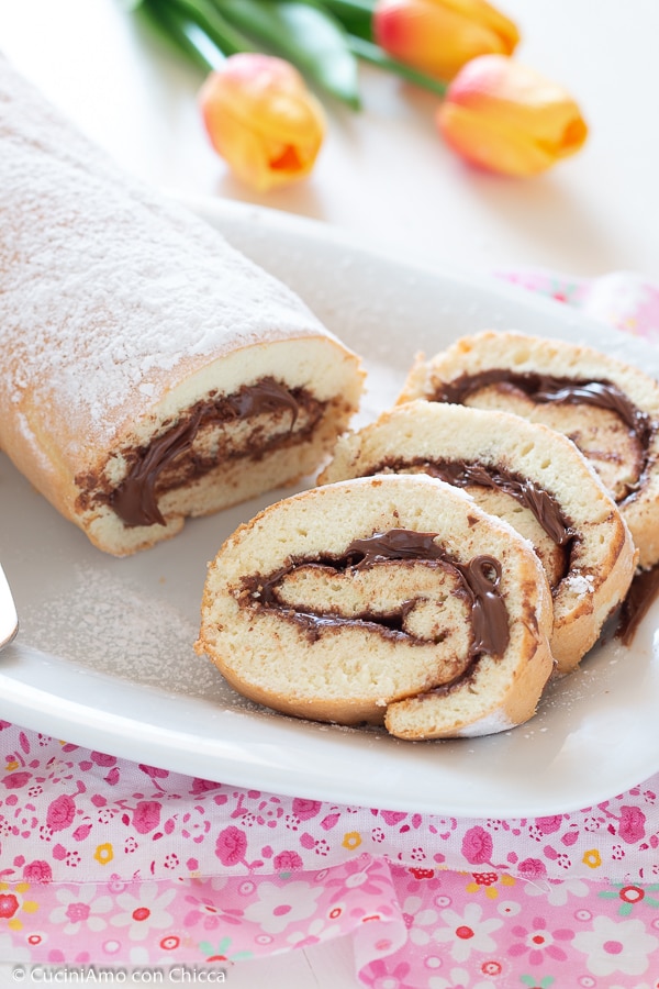 • Sobald er abgekühlt ist, rollen Sie die Rolle aus und füllen Sie sie großzügig mit Nutella.