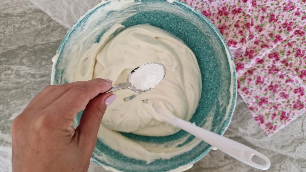 • Fügen Sie auch den Zucker und das Backpulver hinzu. Mischen Sie weiter.