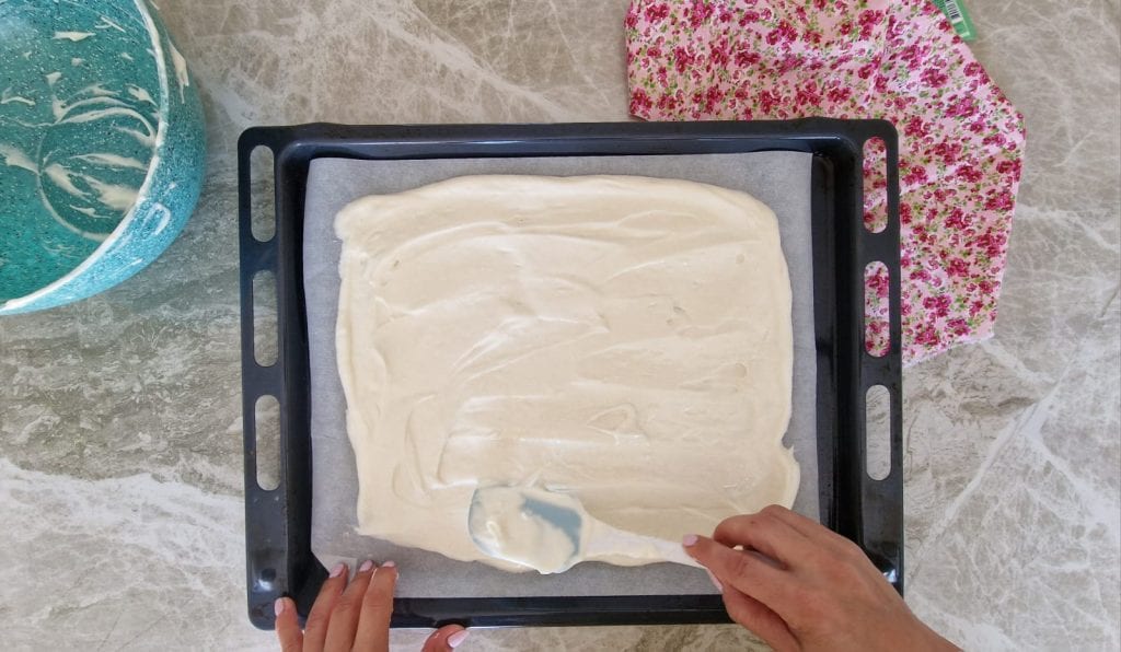 • Gießen Sie die Mischung auf ein mit Backpapier ausgelegtes Blech.