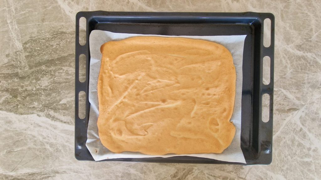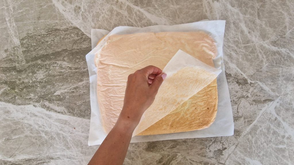 • Entfernen Sie das Papier, rollen Sie den Biskuitteig ein und lassen Sie ihn vollständig eingerollt auskühlen.