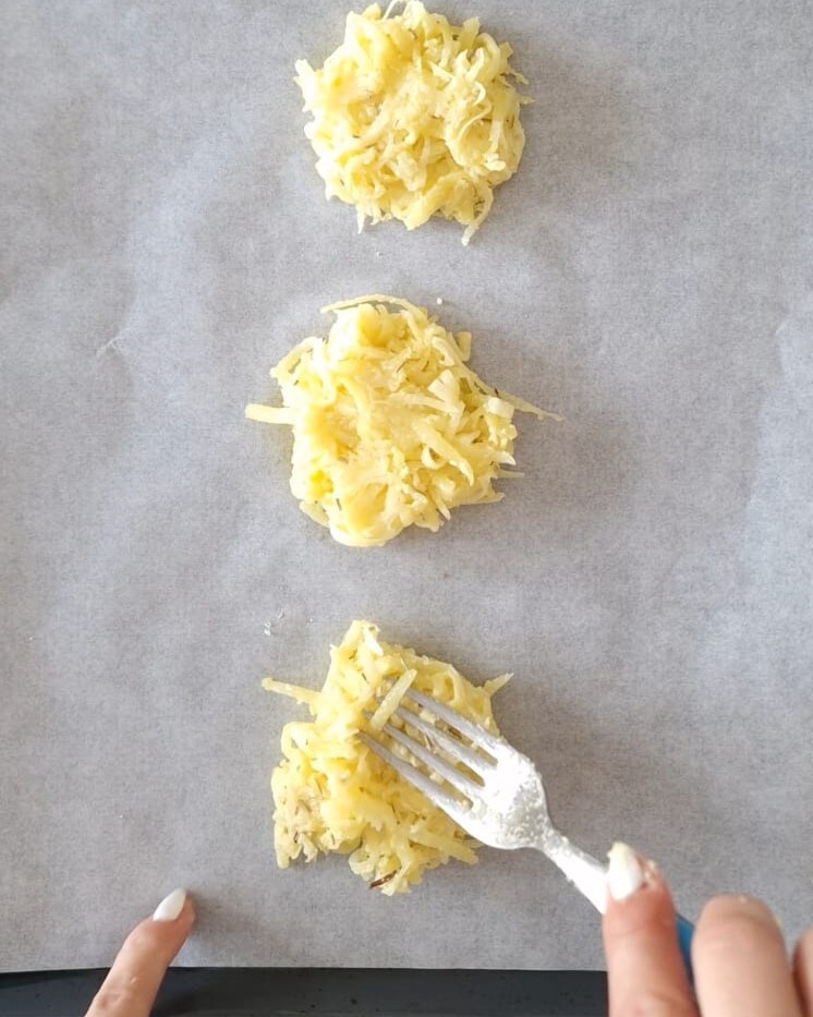 • Legen Sie ein Backblech mit Backpapier aus und machen Sie aus der Mischung viele Häufchen und drücken Sie sie dann mit der Rückseite des Löffels flach, dann mit Rosmarin würzen.