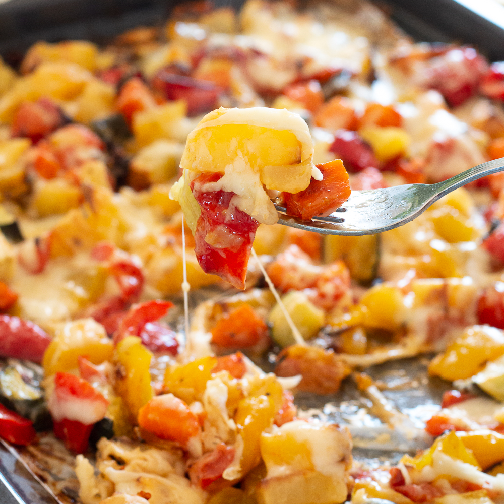 Reiben Sie den Käse (Scamorza oder Mozzarella) über das Gemüse, dann bei 180°C etwa 20 Minuten backen.