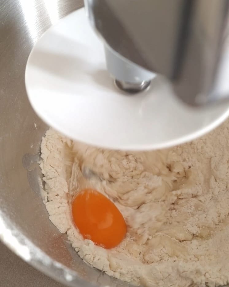 • In einer Schüssel die Hefe mit dem Mehl und Zucker vermischen, dann die lauwarme Milch hinzufügen (achten Sie darauf, dass sie nicht kocht) und beginnen Sie zu kneten, von Hand oder mit der Knetmaschine, dann das Ei und das Öl nach und nach hinzufügen.