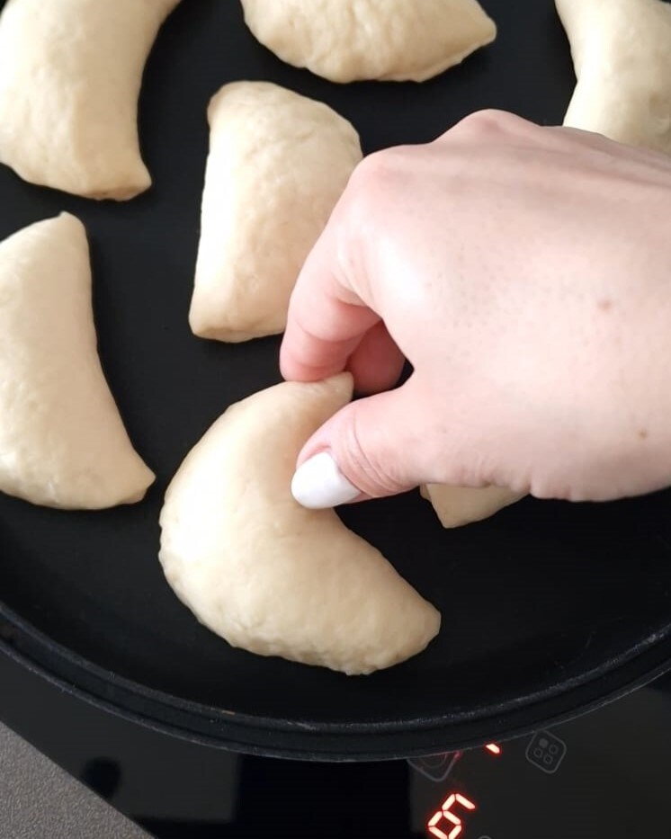 Mit Nutella füllen und leicht mit Wasser befeuchten, dann zu einem Halbmond schließen.
