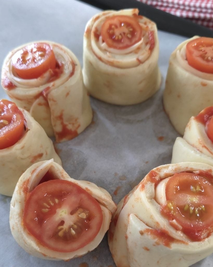 In 4 cm große Stücke schneiden und mit Abstand in eine gut geölte Kranzform legen, dann auf jeden Zylinder eine halbierte Kirschtomate legen und weitere 20 Minuten gehen lassen.