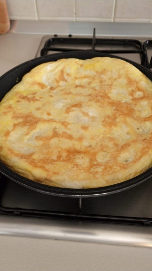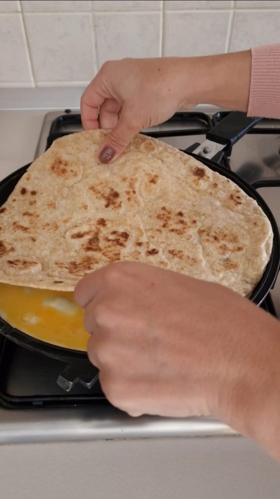 Lege dann die Piadina auf die Eier in der Pfanne und drehe die Piadina anschließend mithilfe einer zweiten Pfanne oder eines Deckels um.