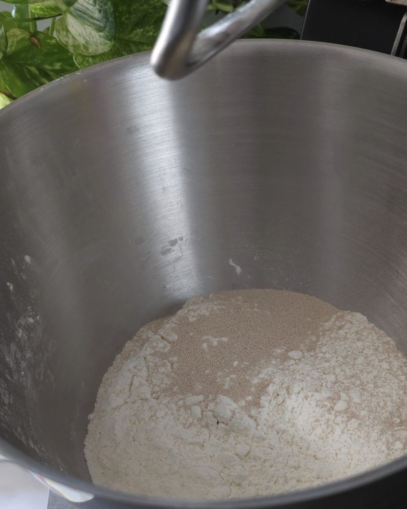 • Geben Sie das Mehl und die Hefe in die Küchenmaschine, danach das Wasser und das Salz; stellen Sie den Knethaken auf mittlere Geschwindigkeit ein.