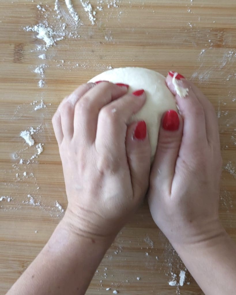 • Übertragen Sie den Teig auf die Arbeitsfläche und falten Sie ihn, formen Sie eine glatte, weiche Kugel, legen Sie ihn in eine Schüssel und decken Sie diese mit einem Tuch oder Frischhaltefolie ab, dann stellen Sie die Schüssel in den ausgeschalteten Backofen mit nur eingeschaltetem Licht für zwei Stunden.