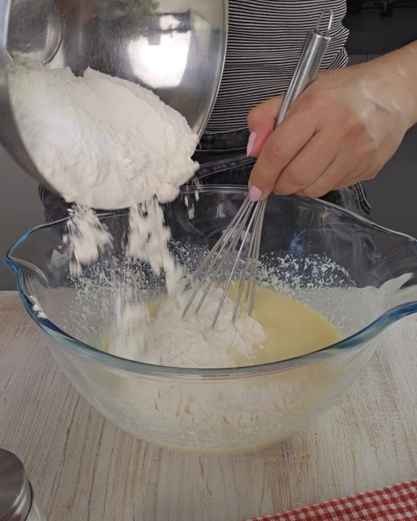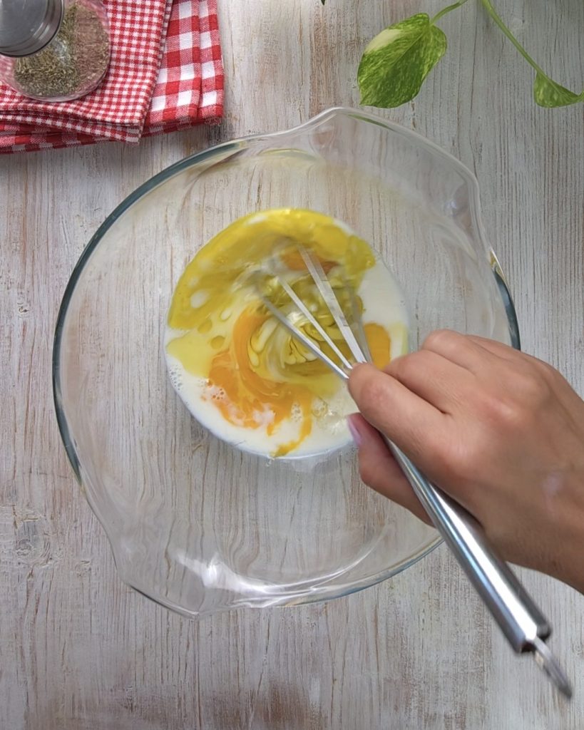 • In einer großen Schüssel die Eier aufschlagen, mit dem Salz vermischen, die Milch und das Öl dazugeben.