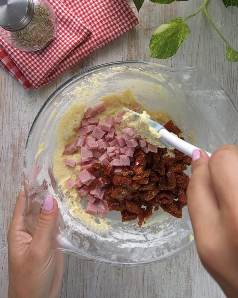 • Die abgetropften und in Streifen geschnittenen getrockneten Tomaten, den in Würfel geschnittenen gekochten Schinken und zuletzt den geriebenen Parmesan hinzufügen.