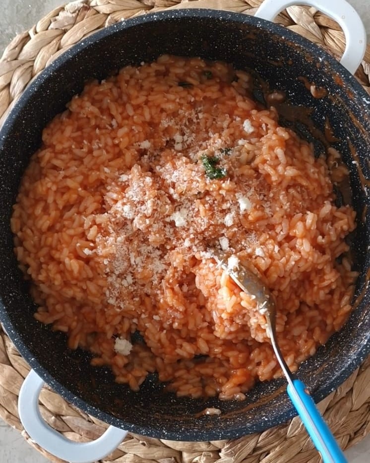 Nach der Kochzeit den Reis in die Pfanne mit der Tomatensauce geben, zusammen mit geriebenem Parmesan.