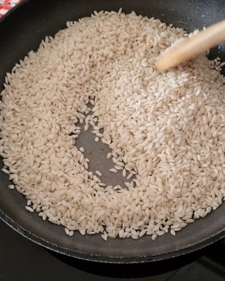 In derselben Pfanne den Reis anrösten, dann einige Kellen heiße Brühe hinzufügen und mit dem Kochen beginnen.