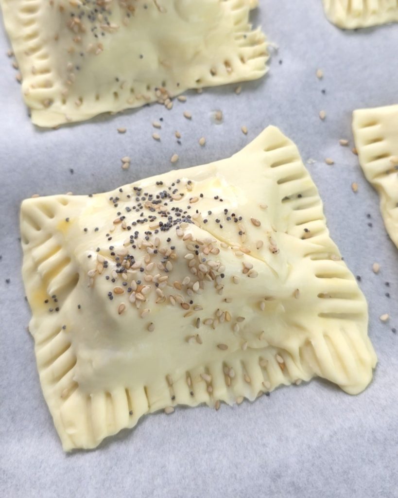 • Legt die Säckchen auf ein mit Backpapier belegtes Blech, bestreicht sie mit verquirltem Ei und bestreut sie mit Sesam. Backt eure Säckchen im vorgeheizten Ofen bei 190°C für 12–15 Minuten.