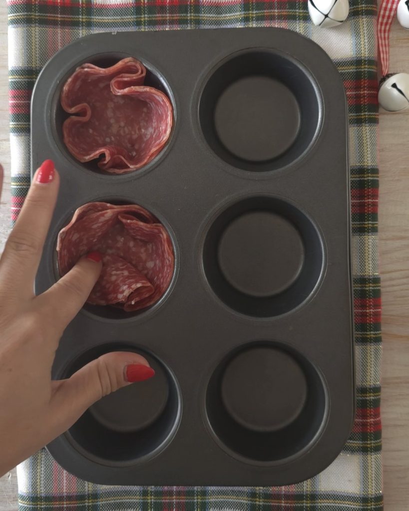 Nehmen Sie zwei Scheiben Salami und überlappen Sie sie leicht über einer Muffinform (es ist nicht notwendig, sie einzufetten). Backen Sie sie dann im Ofen bei 200°C für etwa 5 Minuten.