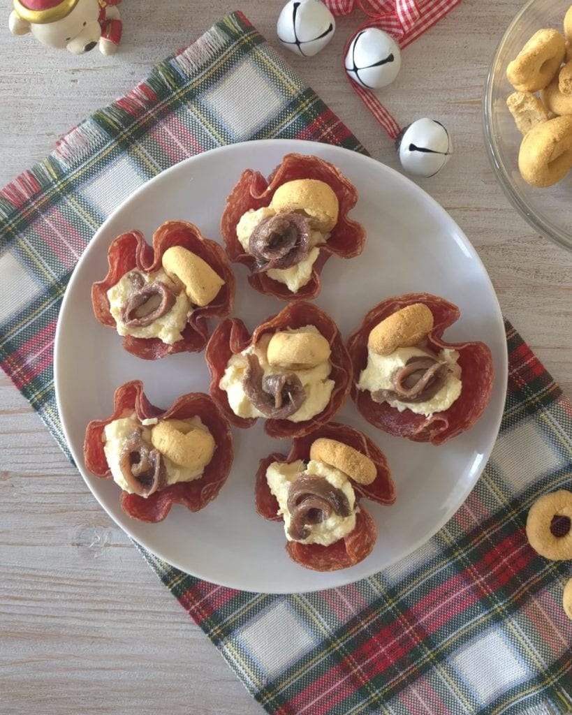 Salami-Körbchen ein einfaches und schnelles Antipasto, ideal um zu den 3 Vorspeisen um alle zu beeindrucken hinzuzufügen. Das Rezept ist wirklich einfach und wenn Sie keine Lust haben, den Ofen einzuschalten, können Sie sie in einer Heißluftfritteuse zubereiten. Die Salami-Körbchen können nach dem Backen mit allem gefüllt werden, was Sie mögen. In meiner Version habe ich Eicreme verwendet, dann mit einem Tarallo und einer Sardelle garniert, aber alternativ können Sie alles durch Oliven und getrocknete Tomaten ersetzen. Wenn Sie auf der Suche nach leckeren Antipasti sind, empfehle ich auch die Sammlung von 5 einfachen und schnellen Antipasti ohne Kochen.