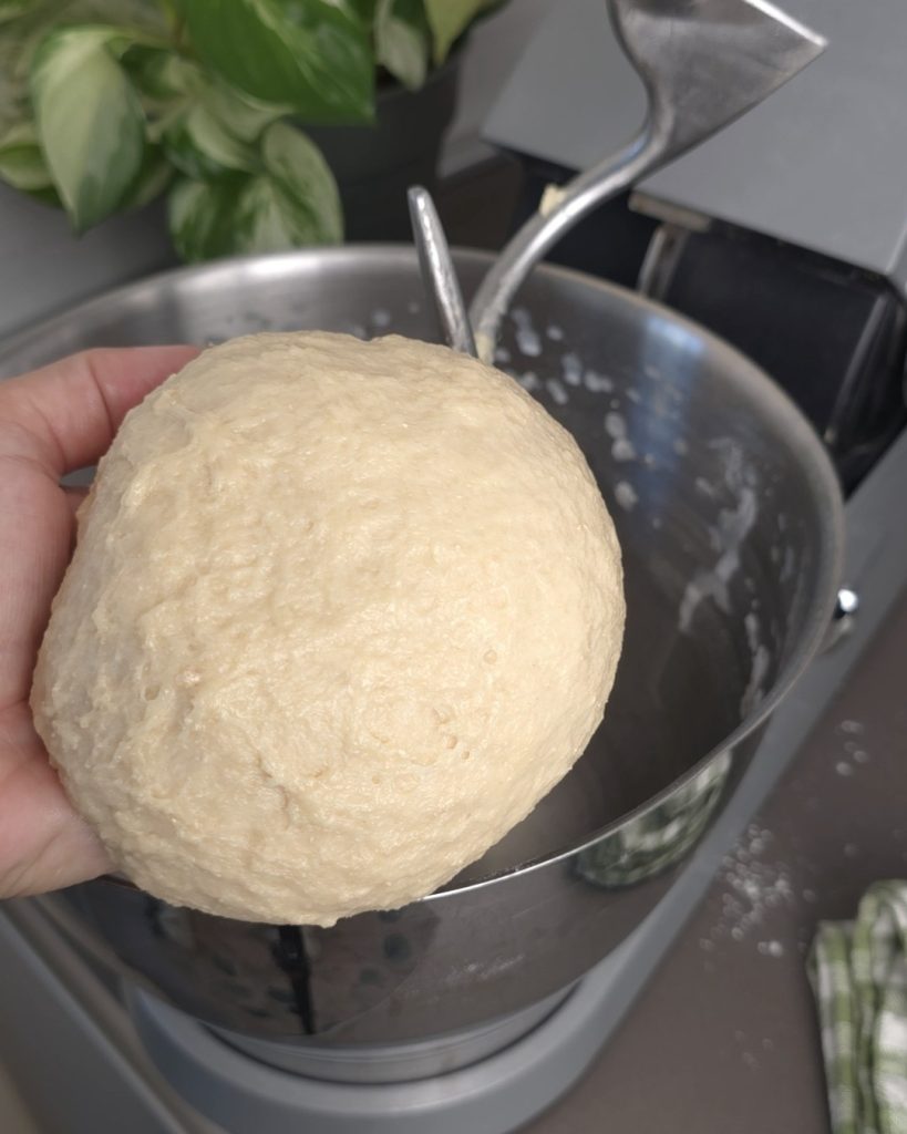 Dann geben Sie nach und nach die Milch hinzu, fügen Sie dann auch das Öl und das Salz hinzu. Kneten Sie gut, bis ein Teigkloß entsteht; lassen Sie ihn 2 Stunden im ausgeschalteten Ofen mit eingeschaltetem Licht aufgehen.