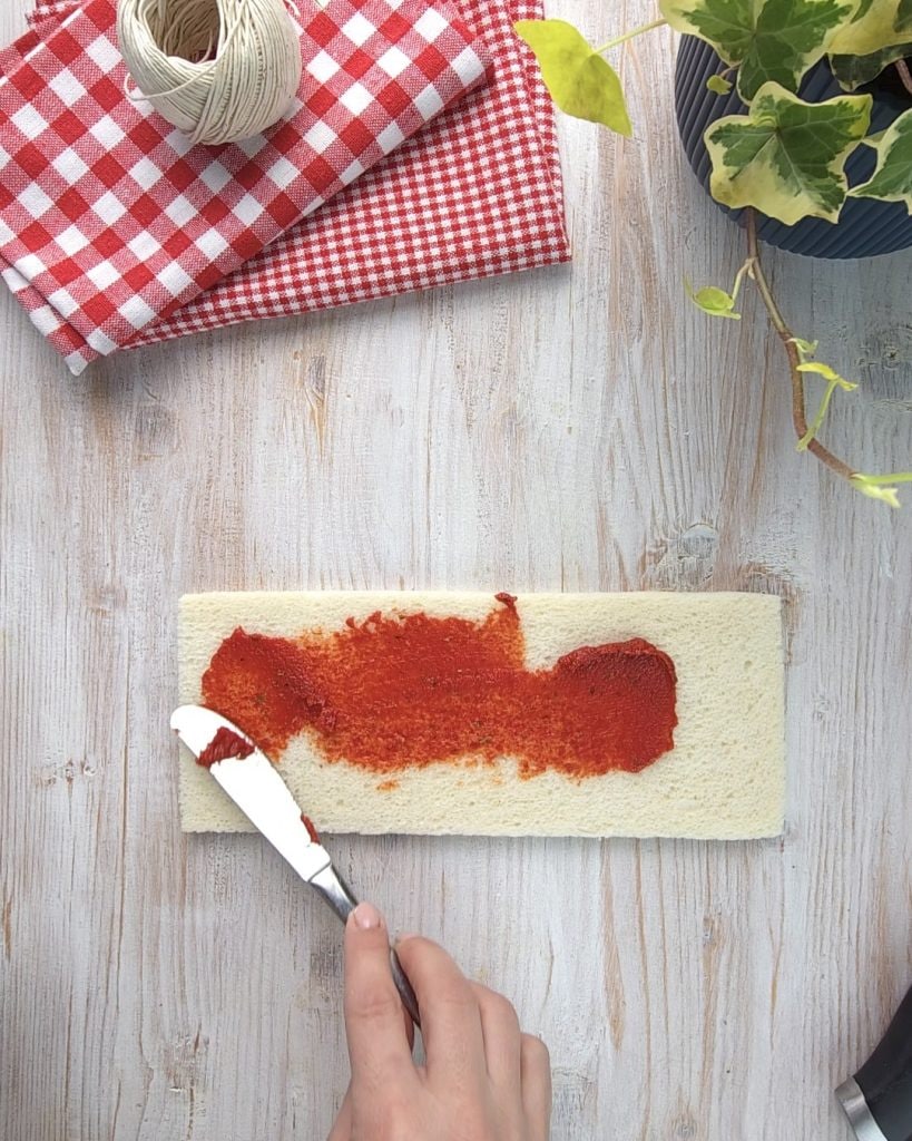 Nehmen Sie eine Scheibe Sandwichbrot und belegen Sie sie mit mit Salz und Oregano gewürztem Tomatenmark, dann fügen Sie den Scamorza hinzu.