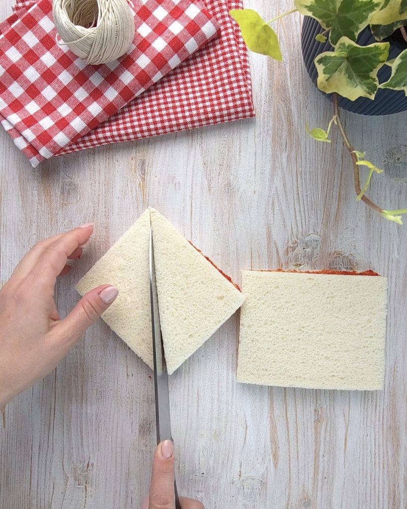 Schließen Sie mit einer anderen Scheibe und schneiden Sie sie zuerst in zwei Hälften und dann in vier.