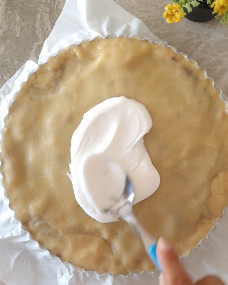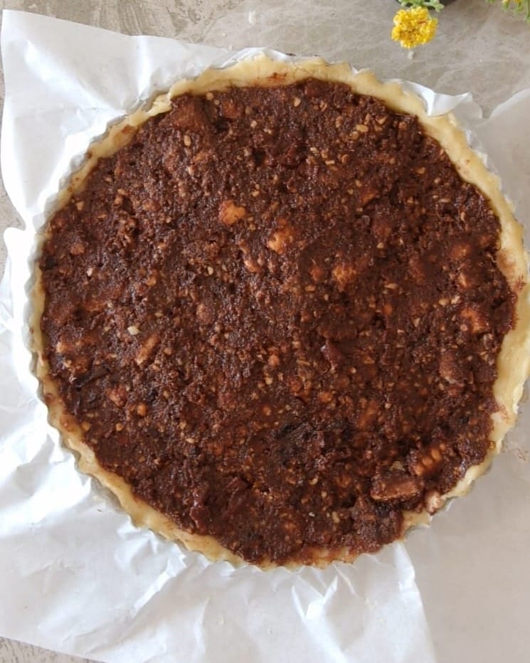 Nach der Ruhezeit den Mürbeteig mit Hilfe eines bemehlten Backpapiers ausrollen, um eine etwa 3-4 mm dicke Teigplatte zu erhalten. Mit der vorbereiteten Füllung die Basis des Kuchens ausfüllen.